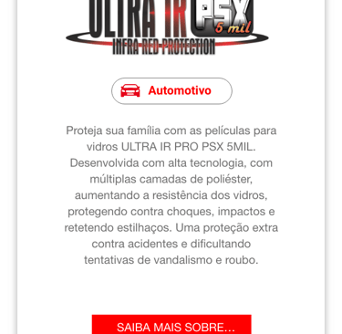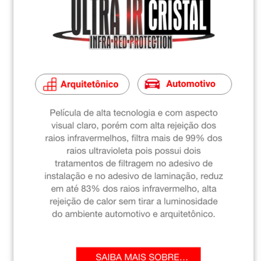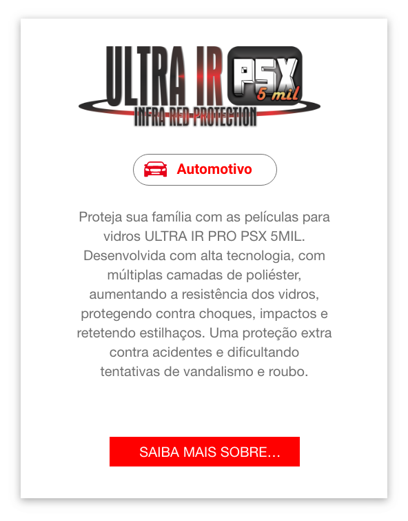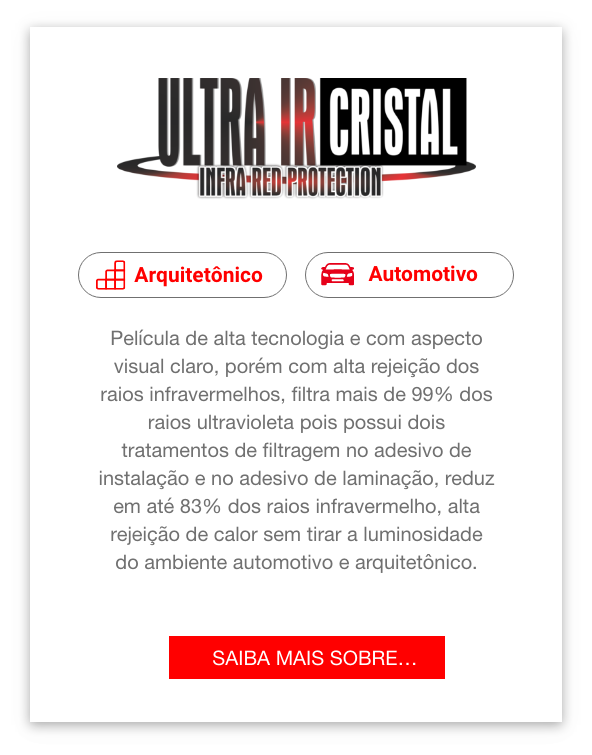 As películas de controle solar ULTRA IR PRO, ULTRA IR CRISTAL E ULTRA IR PSX 5MIL, possuem garantia contra: descascamentos, rachaduras, falhas adesivas, desmetalização, delaminação e desbotamento pelo período de garantia.